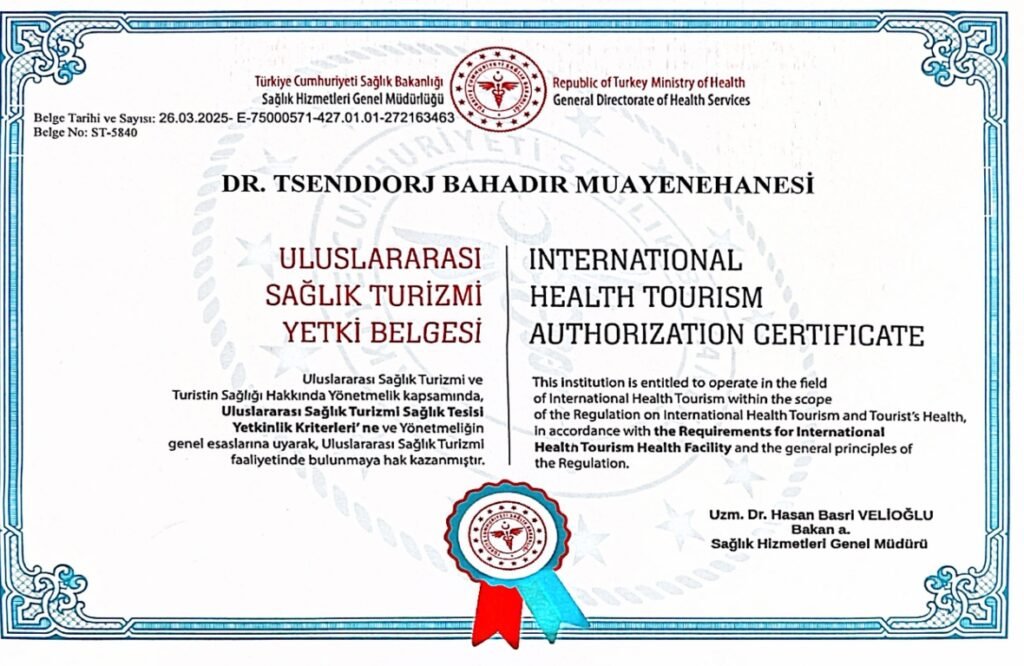 Uluslararası Sağlık Turizmi Yetki Belgesi, Türkiye’de sağlık turizmi faaliyetlerinde bulunmak isteyen hastaneler, klinikler, poliklinikler ve aracı kurumlar için T.C. Sağlık Bakanlığı tarafından verilen resmi bir belgedir.